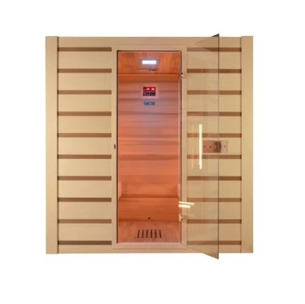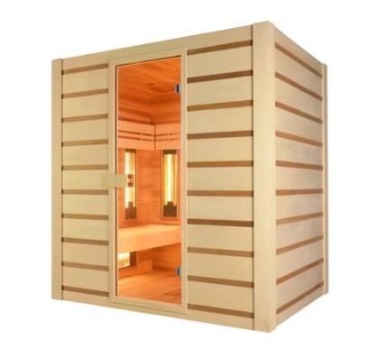 Den infraröda bastun ELEGANT 4002 XXL är särskilt slående i utseende, både vad gäller dess yttre beklädnad och dess ljusa interiör. Det yttre mönstret på väggarna är skapat av en kombination av cederträ och marupaträ . Insidan av den infraröda bastun och båda bänkarna är tillverkade av högkvalitativt och hållbart kanadensiskt hemlockträ. Värmen i den infraröda bastun tillhandahålls av 8 rödljus-/magnesiumelement i väggarna och 1 kolelement i golvet . När rödljuselementen är påslagna börjar de inte bara värmas upp, utan avger också ett behagligt ljus. Den intima atmosfären förstärks av hela bastuns slutna karaktär, där dörren är den enda glasdelen.